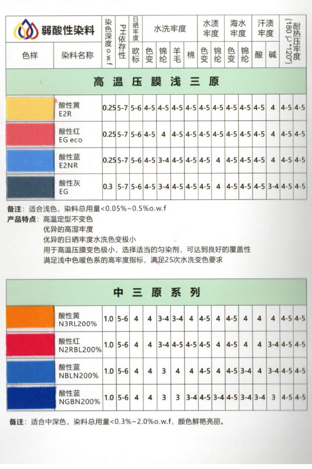 高牢度分散染料作為合成纖維染色的核心材料,以分子結構小、不含水溶性基團為特征,需借助分散劑實現均勻染色。其技術特性聚焦于色牢度提升,涵蓋耐洗、耐光、耐摩擦、耐升華等多維度性能,采用五級制評級體系(耐光牢度為八級),級數越高代表性能越優。例如,蒽醌結構染料因分子穩定性高,耐曬、耐熱性能顯著;偶氮…
